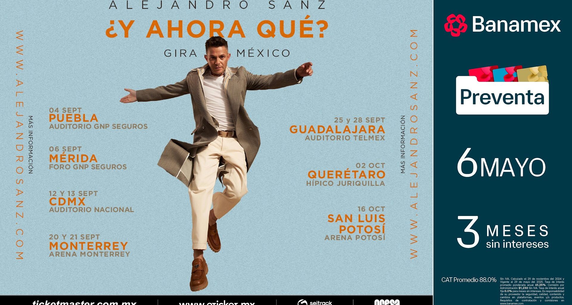 Esta nueva gira, ¿Y Ahora Qué? en México, es una oportunidad única de escuchar en vivo temas atemporales y los nuevos éxitos del artista español. Los boletos estarán en Preventa Banamex a partir del 6 de mayo; la venta general será un día después en las taquillas del inmueble y a través de Ticketmaster, así como en Eticket.