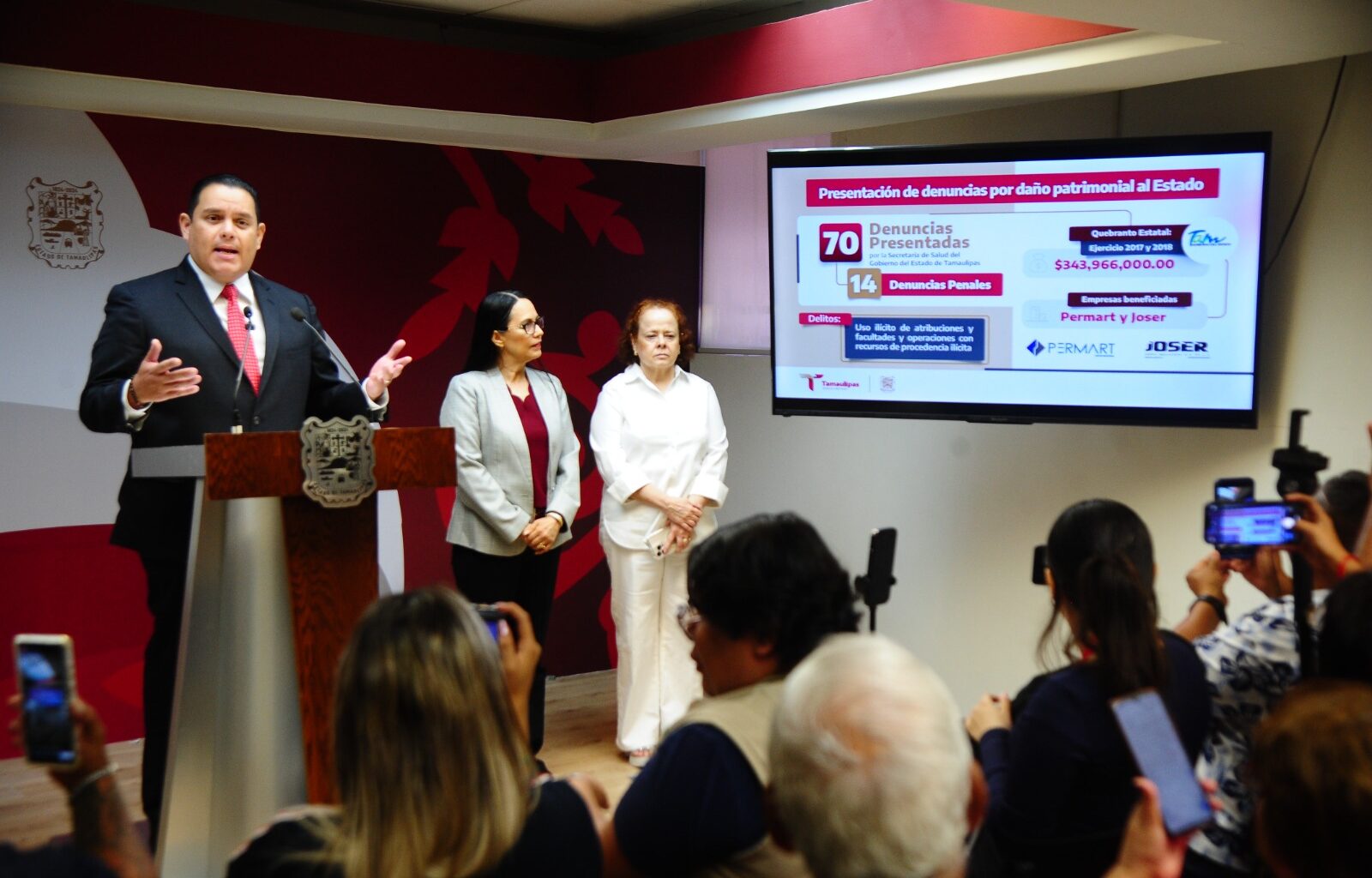Junto al secretario de Salud, Vicente Joel Hernández Navarro; la secretaria Anticorrupción y Buen Gobierno, Norma Angélica Pedraza Melo, y la secretaria de Administración, Luisa Eugenia Manautou Galván, detalló que las denuncias fueron presentadas ante el Congreso del Estado, la Auditoría Superior del Estado, la Auditoría Superior de la Federación y la Secretaría de Anticorrupción y Buen Gobierno de Tamaulipas, y que los ilícitos detectados incluyen el uso indebido de atribuciones y facultades, así como operaciones con recursos de procedencia ilícita.