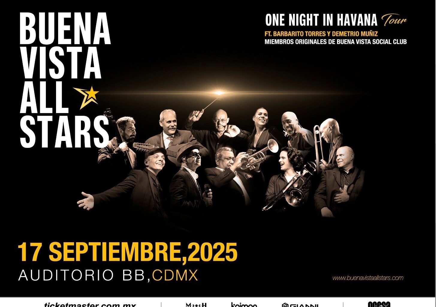 Este 17 de septiembre, el Auditorio BB de la CDMX se llenará del sabor, la elegancia y la historia de la música cubana, con la llegada de Buena Vista All Stars. Prepárate para una noche mágica al ritmo del son, el bolero y otros grandes géneros, con los herederos directos del legendario Buena Vista Social Club. Importantes músicos en escena, que te harán viajar directo a La Habana.