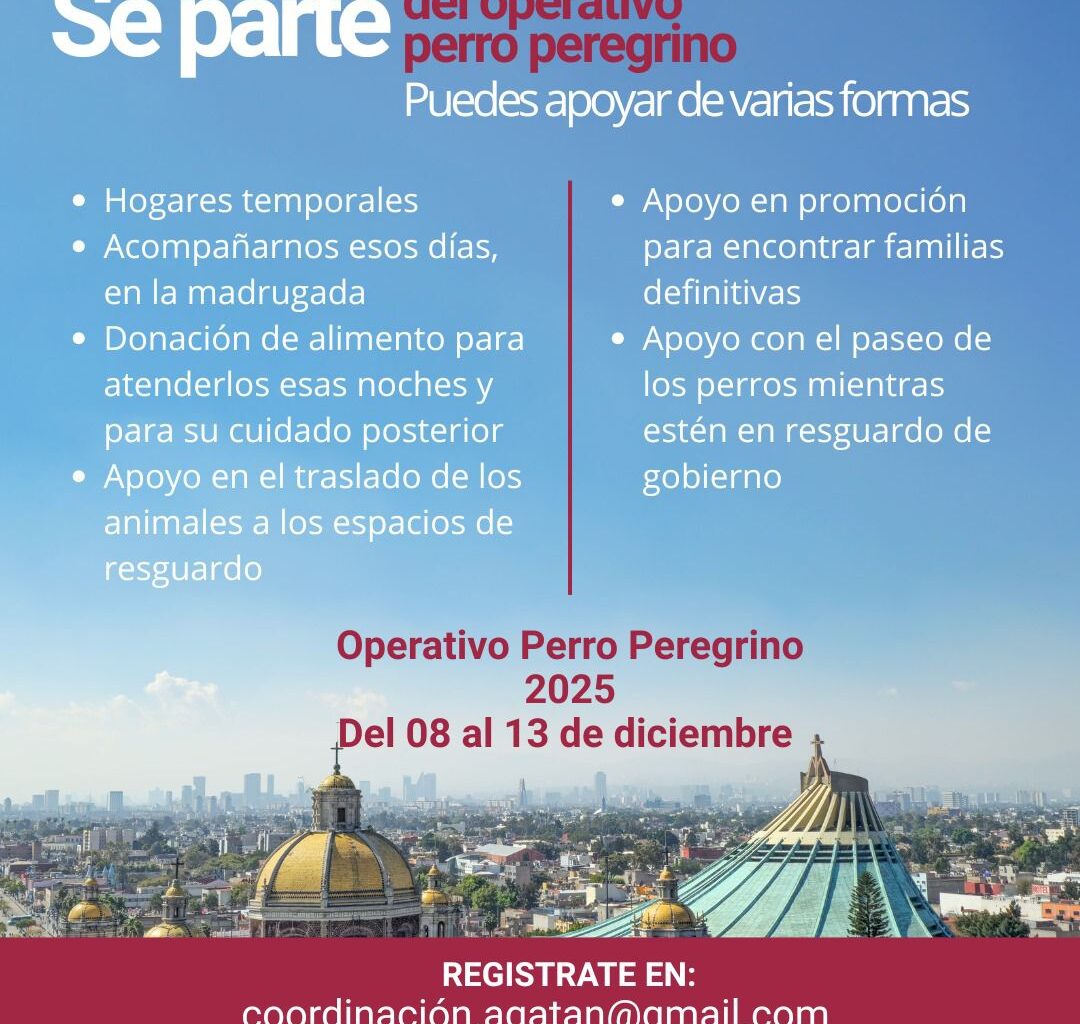 Ciudad de México.— La Agencia de Atención Animal (AGATAN) de la Ciudad de México anunció el Operativo Perro Peregrino 2025, una estrategia especial para atender el incremento de perros abandonados durante las celebraciones a la Virgen de Guadalupe en la Basílica, uno de los eventos religiosos más concurridos del país. La acción se realizará del 8 al 13 de diciembre, con apoyo de asociaciones, rescatistas y ciudadanía.
