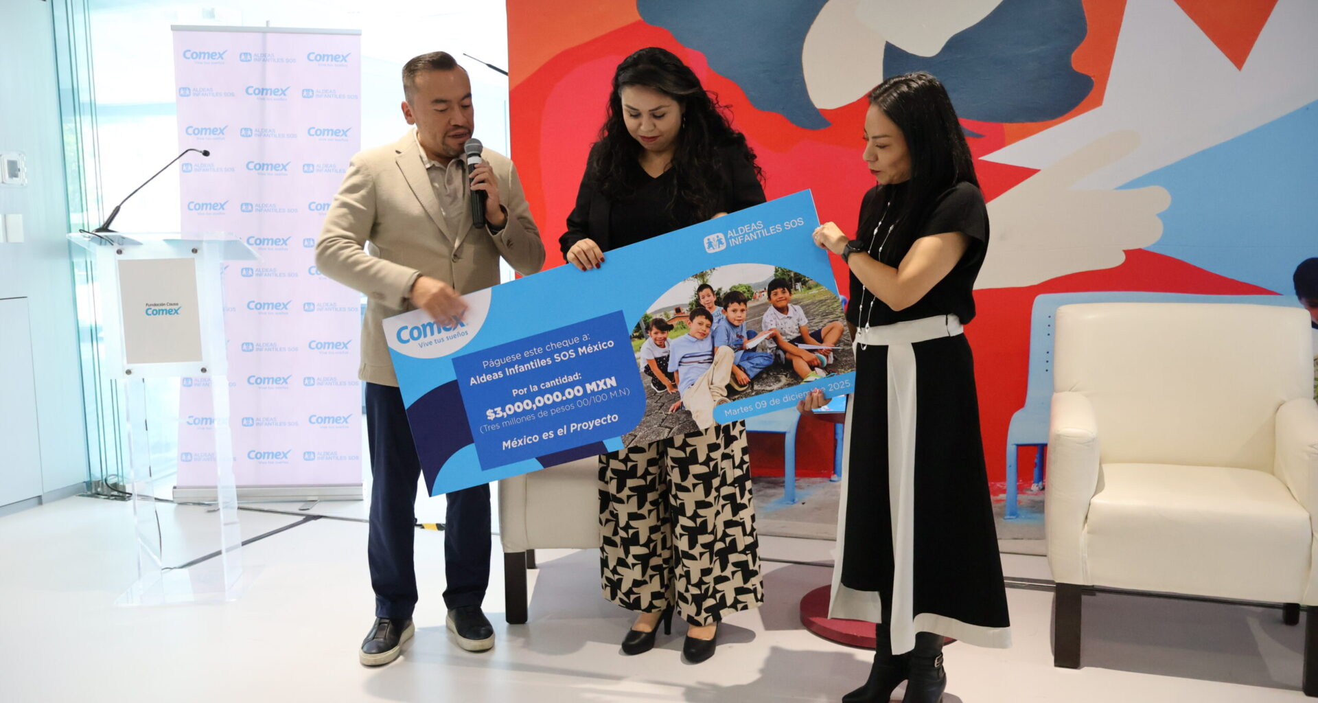 Por su parte, Comex a través de su Fundación Causa Comex, en el marco de su iniciativa “México es el Proyecto”, a partir del mes de septiembre busca año con año realizar un donativo a una causa en específico que se alineé a los pilares que construyen un mejor México. En esta ocasión ha contribuido con un donativo de 3 millones de pesos a Aldeas Infantiles SOS México, destinados a cubrir aspectos esenciales del cuidado diario: educación, alimentación, desarrollo de habilidades para la vida, bienestar físico y emocional, que les brinde autonomía a los jóvenes.