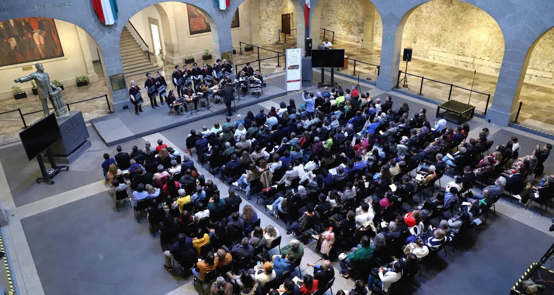 Vestidos con distintivos zarapes negros y moños carmesí, la agrupación interpretó alegres canciones como el son “La Madrugada”, del Mariachi Vargas de Tecalitlán; el huapango veracruzano “El Cascabel”; “Fina Estampa”, de la compositora española María Dolores Pradera y “La Chilena”, de la Rondalla Tapatía.
