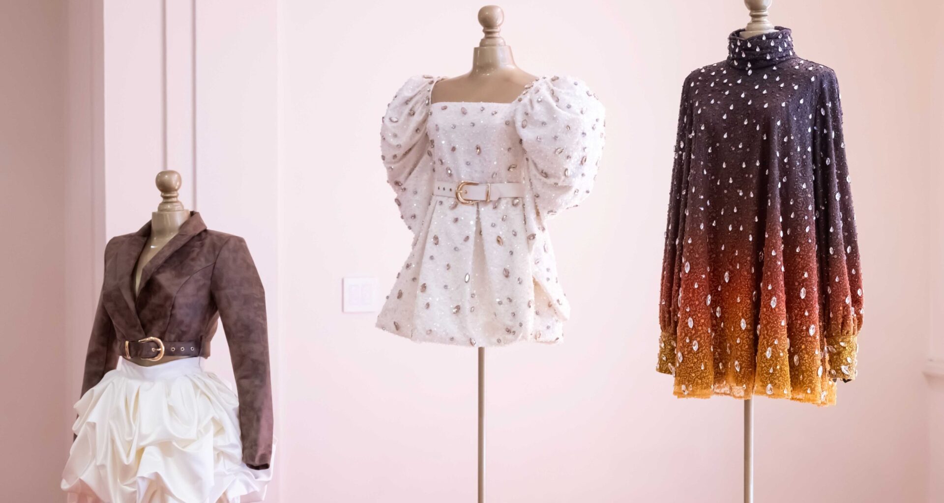 La materialidad juega un papel protagónico. Relieves, aplicaciones, pedrería y textiles con volumen crean superficies que evocan sensaciones táctiles, mientras que la paleta cromática —dominada por tonos chocolate, acentos dorados y matices crema— se despliega en degradados que aportan profundidad y dinamismo a cada diseño.