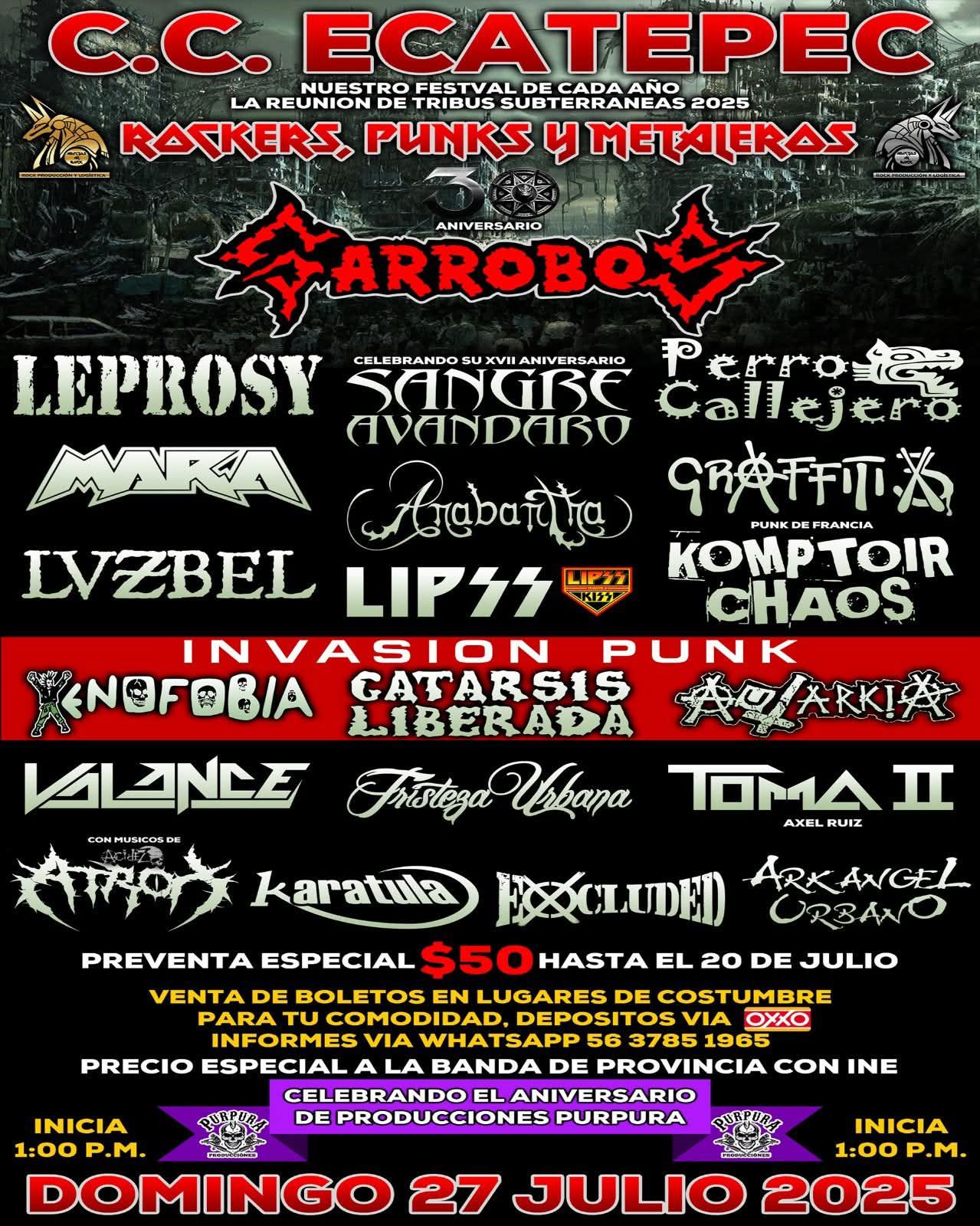 Dicho festival, encabezado por Garrobos, forma parte de una celebración múltiple que contempla el aniversario de la banda, el proyecto “Tribus Subterráneas” –concepto creado por BamBam hace ya varios años– y la trayectoria de Producciones Púrpura, casa productora que ha sido pieza clave en la difusión de la escena alternativa mexicana. El cartel del evento contará con agrupaciones nacionales e internacionales como Komptoir Chaos (Francia), Leprosy, Sangre de Avándaro, Perro Callejero, Graffiti 3X, Anabantha, Mara, Lipss (tributo a KISS), Luzbel, Xenofobia, Catarsis Liberada, Autarkia, Vlance, Tristeza Urbana, Toma II, Atrox (con músicos de Acidez), Karátula, Excluded y Arkangel Urbano, entre otros, en una jornada musical que dará inicio a partir del mediodía.