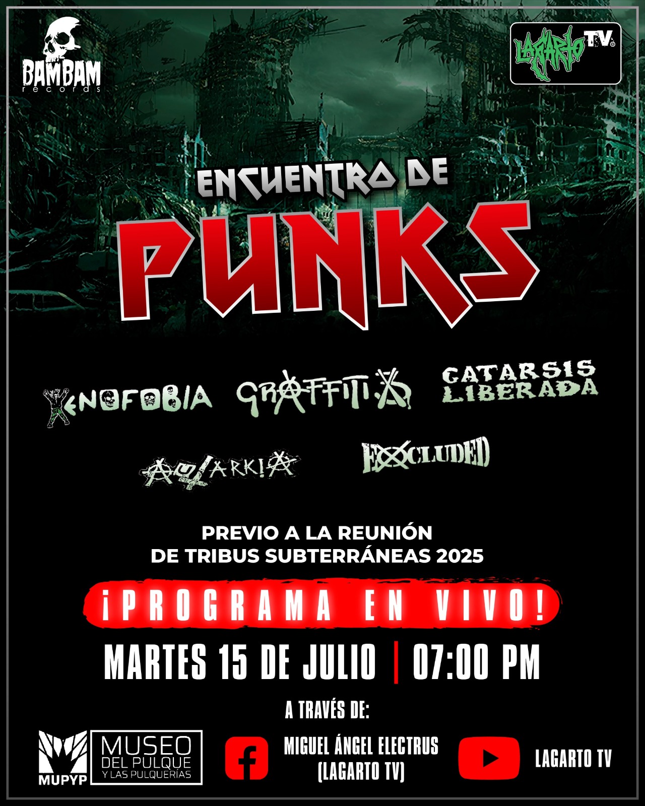 Será el próximo domingo 27 de julio cuando el Centro Cívico de Ecatepec se transforme en un altar pagano de guitarras incendiarias y corazones al rojo vivo. Un festival donde no habrá lugar para la tibieza, donde el escenario será trinchera y donde cada acorde será testimonio de vida. Para anticipar esa jornada que promete ser histórica, cinco de las agrupaciones que forman parte del cartel se encontrarán este martes 15 de julio en el legendario Museo del Pulque, a las 18:30 horas, para compartir con el público y a través de la señal de Lagarto TV, sus historias, su presente y el espíritu con el que encaran esta celebración.