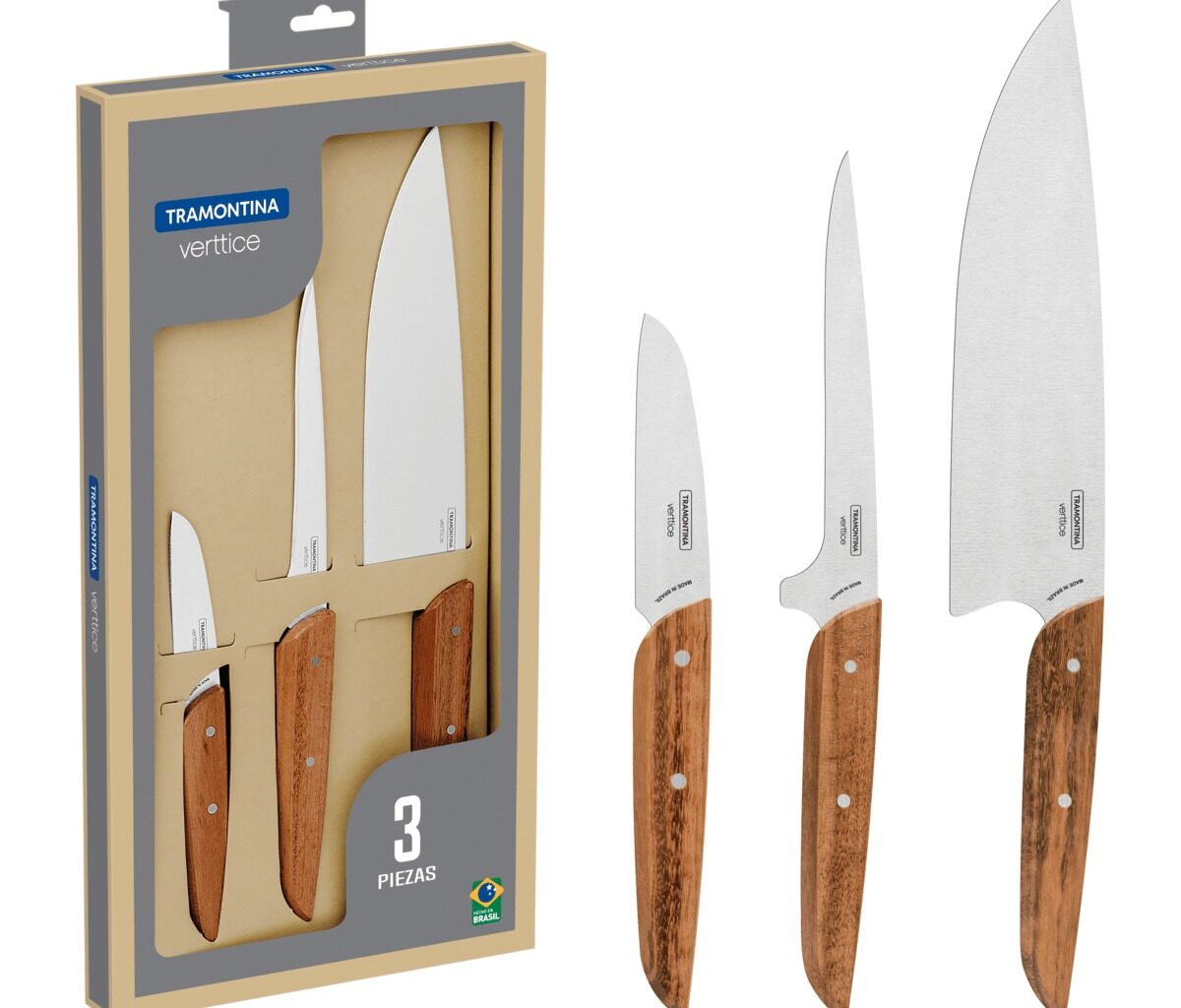 - Juego de cuchillos Verttice con mangos de madera natural, 3 piezas Fabricados con lámina de acero inoxidable, sus piezas disponen de un excelente poder de corte y son altamente durables. Los mangos de madera natural con remaches de acero inoxidable son más resistentes y aportan un aspecto rústico y lleno de estilo.