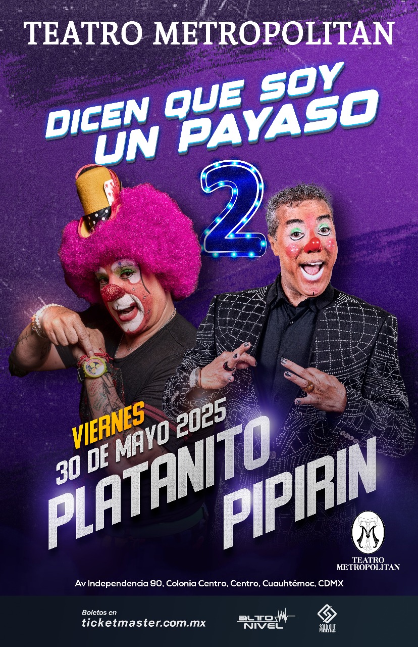 El próximo viernes 30 de mayo de 2025, a las ocho de la noche, el Teatro Metropolitan de la Ciudad de México será testigo de una de las noches más divertidas y esperadas del año. Los icónicos comediantes Platanito y Pipirín se presentarán en el marco de su gira “Dicen que Soy un Payaso 2”, un espectáculo que promete arrancar carcajadas a todo el público con su humor característico, ocurrencias únicas y un repertorio lleno de sorpresas. Boletos a la venta en el Sistema Ticketmaster y en taquillas del inmueble.