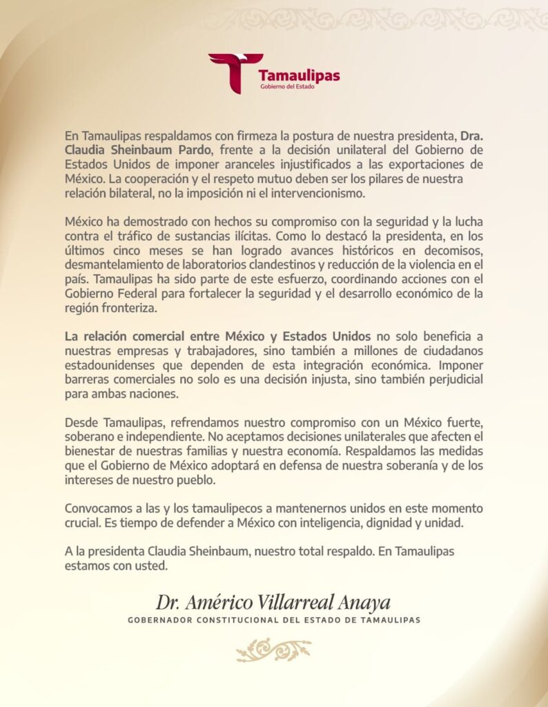 “Desde Tamaulipas refrendamos nuestro compromiso con un México fuerte, soberano e independiente. No aceptamos decisiones unilaterales que afecten el bienestar de nuestras familias y nuestra economía. Respaldamos las medidas que el Gobierno de México adoptará en defensa de nuestra soberanía y de los intereses de nuestro pueblo”, agregó el mandatario tamaulipeco.