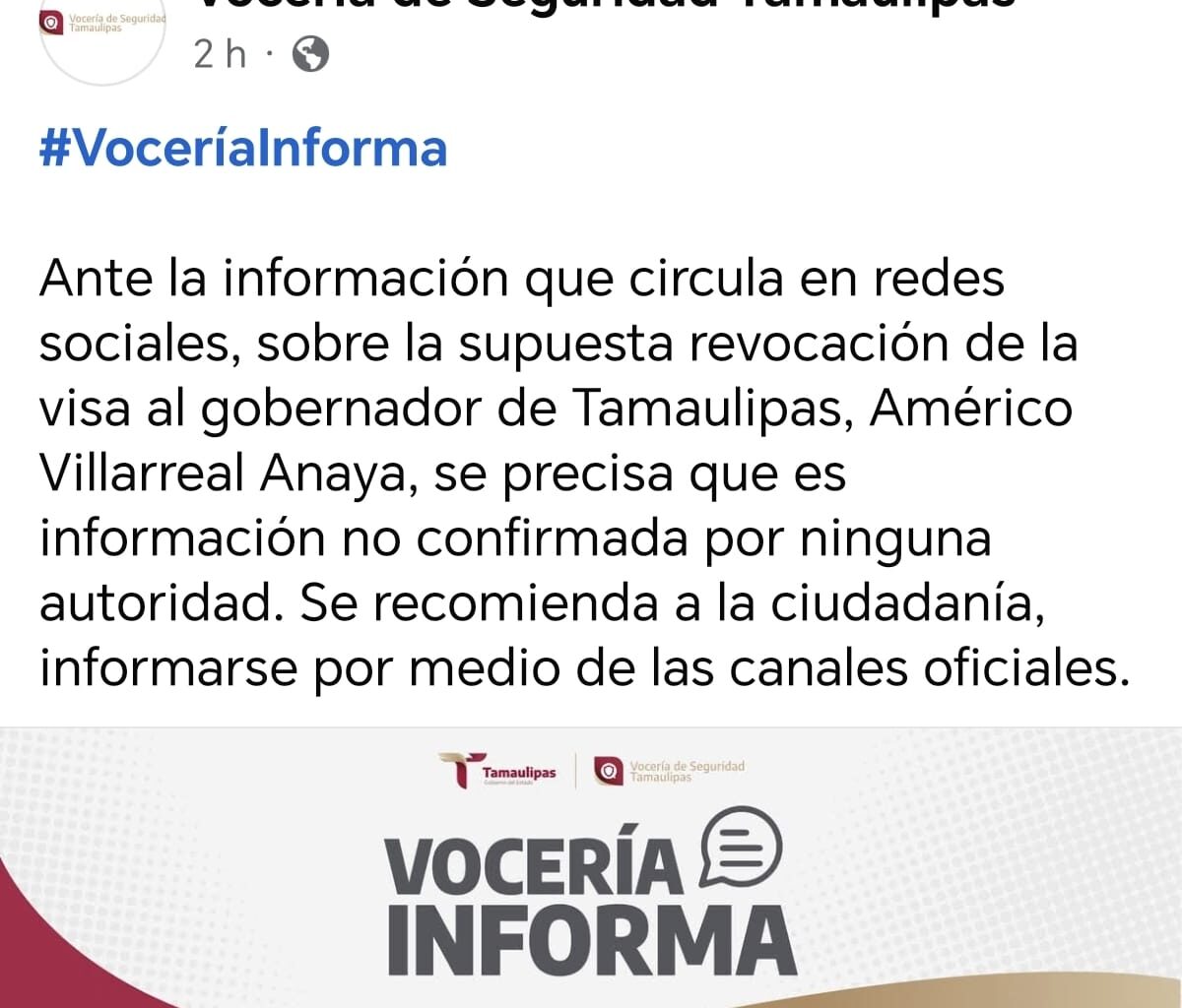 La vocería de Seguridad de Tamaulipas desmintió, mediante su página oficial, la supuesta revocación de la visa al gobernador del Estado Américo Villarreal Anaya.